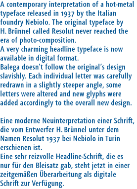A contemporary interpretation of a hot-metal typeface released in 1937 by the Italian foundry Nebiolo. The original typeface by
