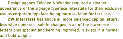 Die Designagentur Zeichen und Wunder verlangte nach einer saubereren Anmutung der Verkehrszeichenschrift Interstate als ihrer exkusiven Hausschrift, damit sie sich besser als Textschrift eignet.