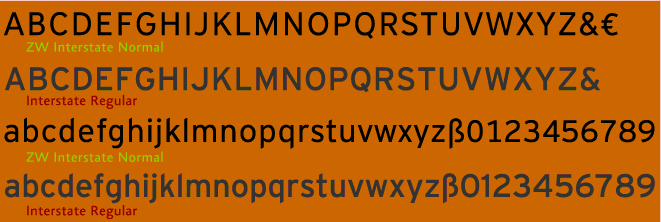 ZW Interstate unterscheidet sich vor allem durch ausgeglichenere Proportionen der Großbuchstaben, weniger breite Ziffern, behutsame Veränderungen in den Kleinbuchstaben und durch eine verbesserte Zurichtung und Unterschneidung. Sie wurde in einem normalen und einem fetten Schnitt gezeichnet.