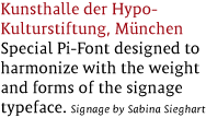 Special Pi-Font designed to harmonize with the weight and forms of the signage typeface. Signage by Sabina Sieghart